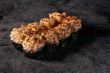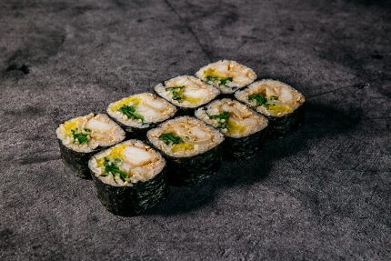 Диапазон цен: 10,20 BYN – 17,00 BYNКреветка в кляре, такуан, огурец, икра летучей рыбы, соус спайси, рис, нори