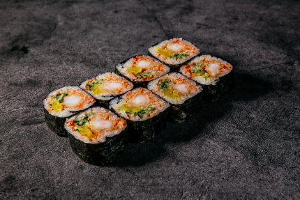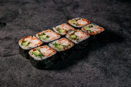 Диапазон цен: 10,20 BYN – 17,00 BYNКреветка, авокадо, огурец, икра летучей рыбы,соус спайси, рис, нори