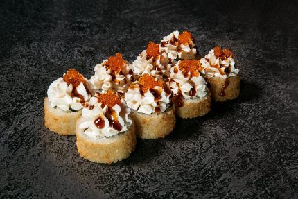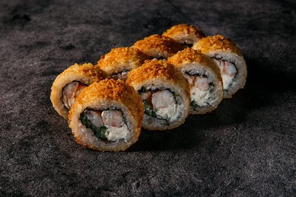 Диапазон цен: 11,40 BYN – 19,00 BYNБекон, огурец, такуан, кляр, сухари панко, сыр, соус терияки, икра летучей рыбы, рис, нори