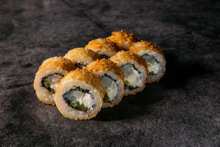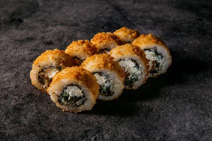 Диапазон цен: 11,40 BYN – 19,00 BYNУгорь, огурец, сыр, смесь темпура, сухари панко, соус терияки, рис, нори