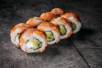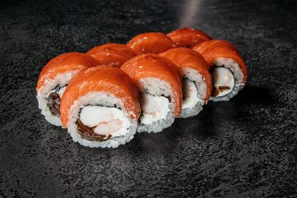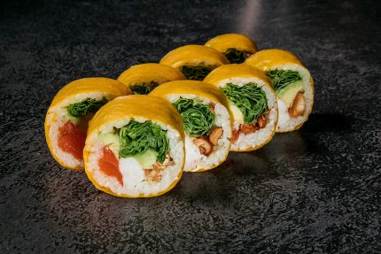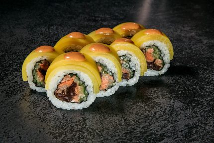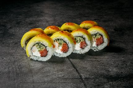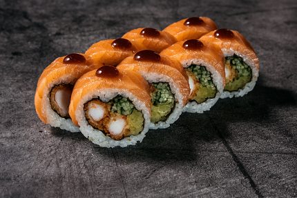 Диапазон цен: 13,80 BYN – 23,00 BYNЛосось(опаленный), угорь, авокадо, соус трюфельный терияки, нори, рис