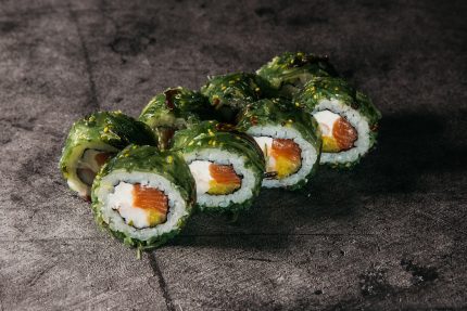 Диапазон цен: 11,70 BYN – 19,50 BYNЛосось, окунь опаленный, авокадо, сыр, лук зеленый, соус спайси, рис, нори