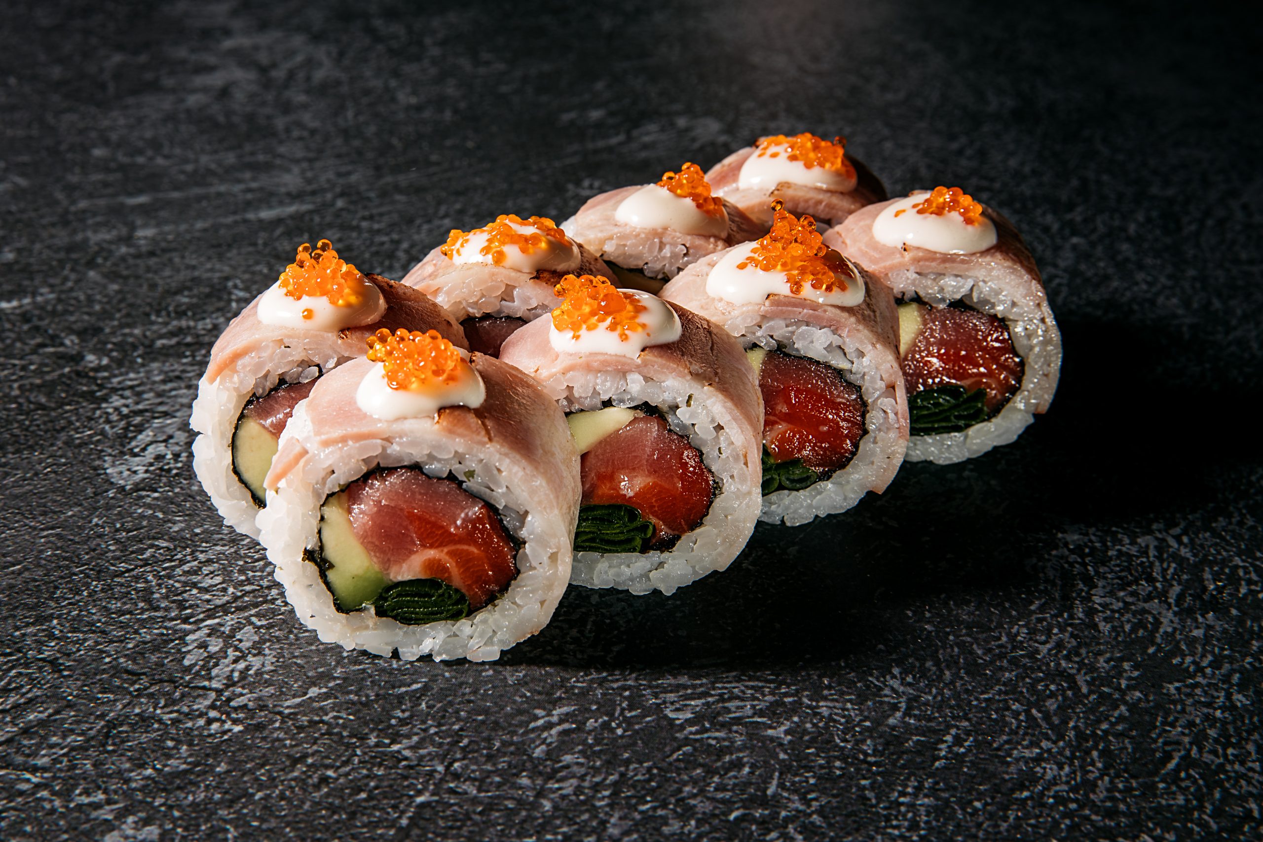 Ролл с беконом, лососем и тунцом