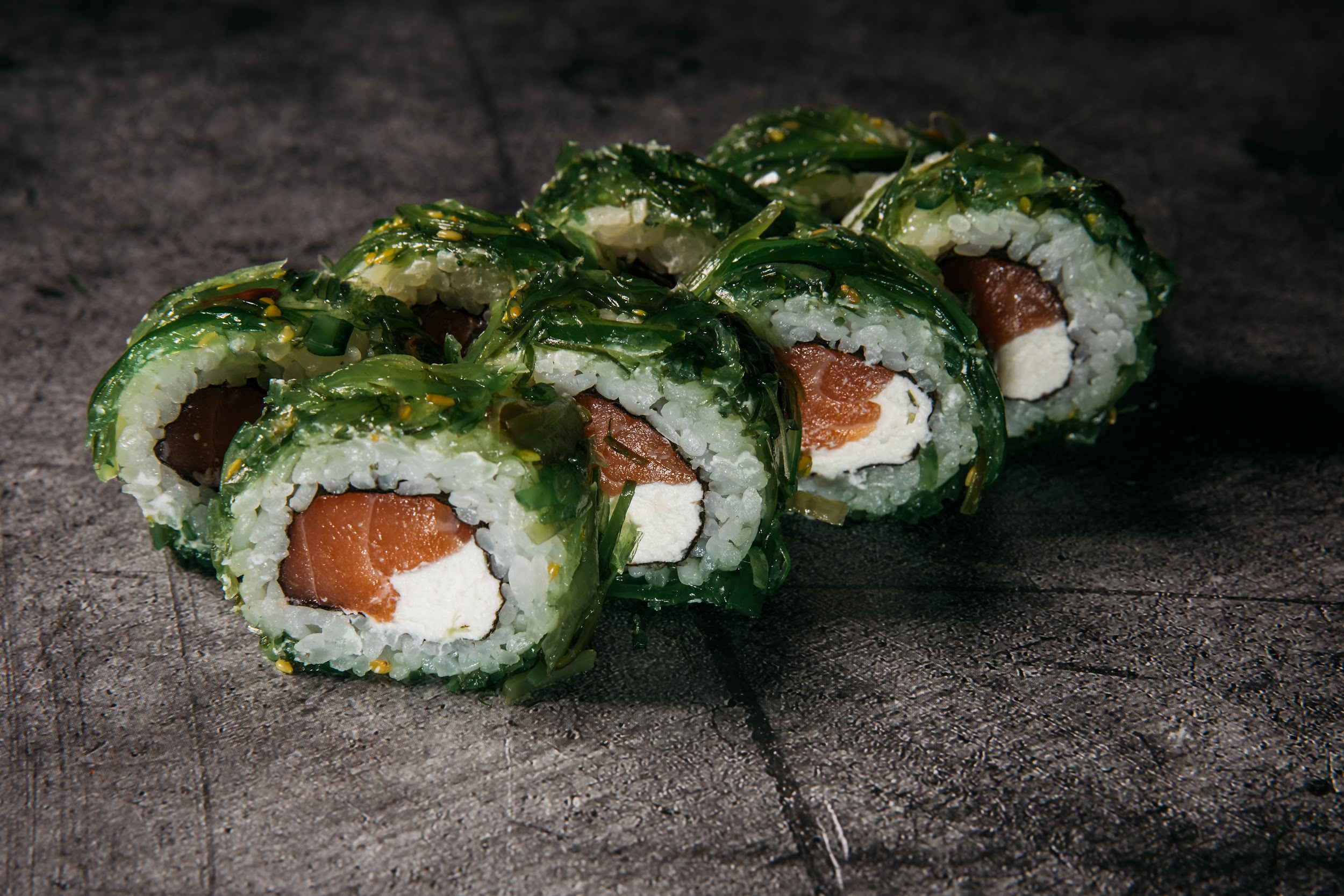 Лосось, сыр, салат чука, соус ореховый, рис , нори