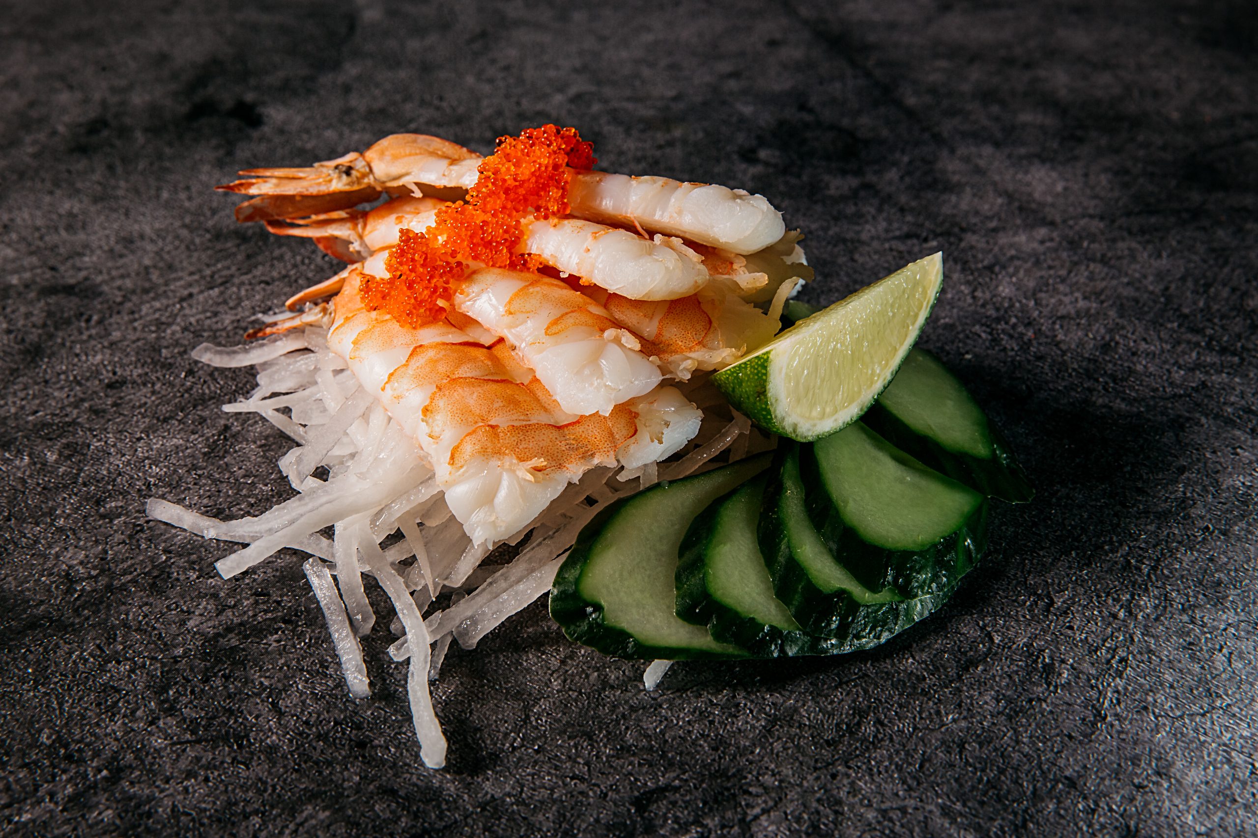 Креветка, дайкон, огурец, икра летучей рыбы, лайм
