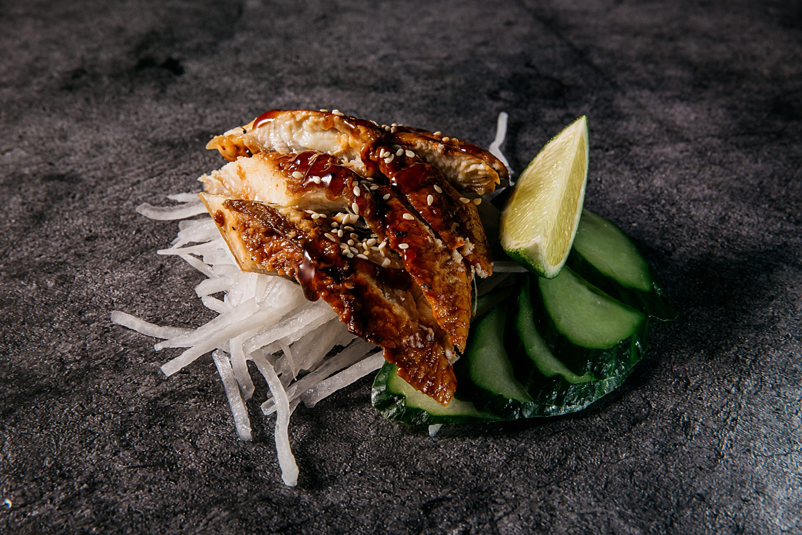 Угорь, дайкон, огурец, соус терияки, кунжут, лайм