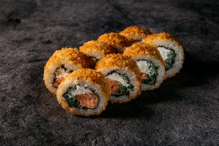 Лосось, огурец, сыр, смесь темпура, сухари панко, соус терияки, рис, нори